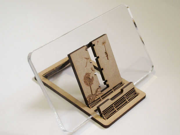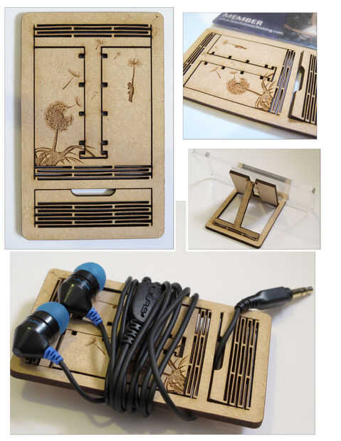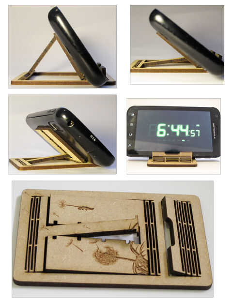 El stand de teléfono es cortado fino 1/8" tablero mfd usando un cortador láser. Es el tamaño de una tarjeta de crédito por lo que cabe en tu cartera. También puede utilizar como un abrigo de auriculares. El stand tiene ángulos ajustables y soporta orientaciones paisaje y retrato. El soporte es perfecto para video chatear y ver películas.