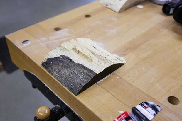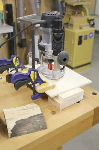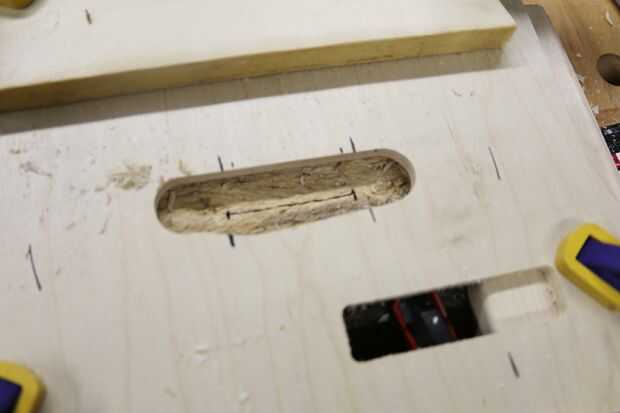 Para ello, hice una guía rápida que se sentaría sobre pilotes que flanquean mi corteza de madera. Medí a donde quería el recorte al estar centrada en mi material.