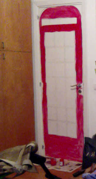 Proteger los lados de la puerta, manija de la puerta, el piso y las paredes con periódicos. pintura de acrílico es difícil de quitar.
