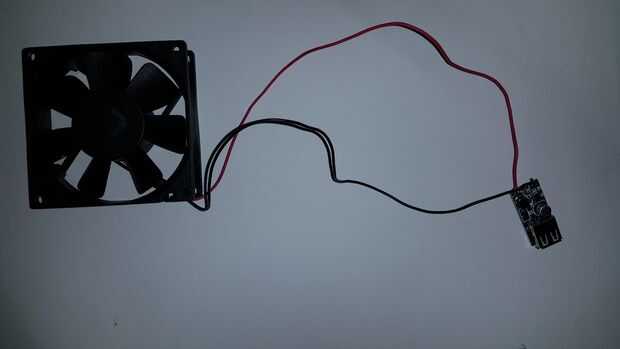 Poner los cables del ventilador sobre el + y - del módulo Step-up. El cable rojo del ventilador va a + y el negro va a -.