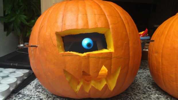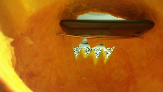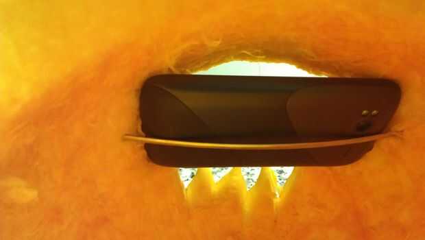 Sí, hay una app para eso. Es relativamente sencillo, sólo cortar un orificio cuadrado un poco más pequeña entonces el tamaño de la pantalla de su teléfono celular, encontrar algo que sostenga contra la calabaza; I utilizar pinchos de metal y finalmente encontrar un video de animación de algunos - los ojos o boca o lo que sea. Asegúrese de que usted es video tiene repetición (difícil de encontrar uno que no). También puede considerar energía. Asegúrese de que dejar suficiente espacio para enchufar el cargador por si acaso.