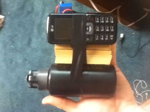 Ahora no desea que todos estos cables asomando todo el lugar ¿te? ¡No es posible! Ahora es el momento para meter todo en un paquete bonito, aseado. En el futuro, que usando la caja de un proyecto para proteger el teléfono y el de los bb y tal, pero para el primer prototipo Esto funcionó muy bien. Asegúrese de que hay algo que separa el motor y thunder B para que haya espacio para el perno que se tirará. Este paso dependerá en gran medida su estructura personal, así que ofrecerá imágenes como guía, pero de ninguna manera es la manera de set para hacer las cosas.
