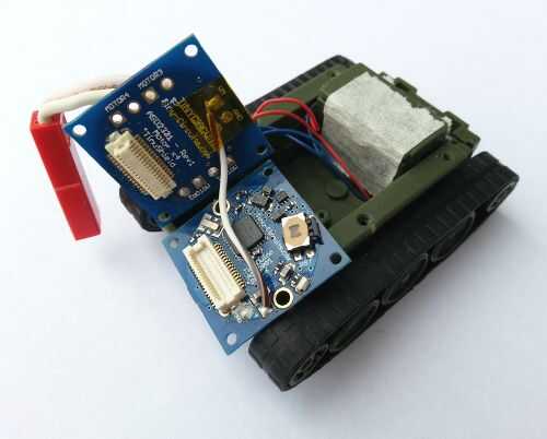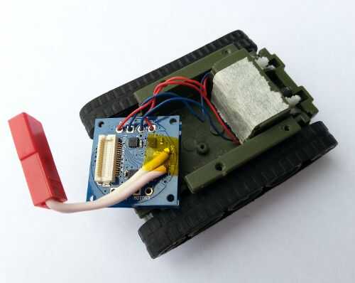 Después de desconectar la electrónica original, los TinyDuino de controlador de motor y placa de procesador se pueden soldar en su lugar. Corte el cable de extensión de batería JST con cerca de 1 pulgada de alambre a la izquierda conectado a la conexión. Tome el extremo del cable con el conector macho y estos cables en el Motor x4 TinyShield VM (cable rojo) y GND (cable negro) las conexiones de la soldadura. Puesto que la fuente de alimentación es una batería de litio solo con una tensión máxima de 4,2 voltios, la placa puede ser alimentada por soldar un cable de VM en la tarjeta controladora al positivo de la batería terminal, etiquetado '+', en el tablero. Luego, los cables del motor deben soldarse a los cojines MOTOR1 y MOTOR2 en el tablero de regulador del motor. Este ejemplo conecta la pista izquierda a MOTOR2 y el buen camino a MOTOR1, pero la conexión del motor y la dirección se pueden cambiar en el código. Asegúrese de que la conexión de alimentación está aislada. Las juntas soldadas se muestran a continuación: