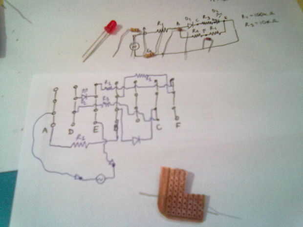 Desde LEDs necesitan una fuente de baja tensión y que costaría mucho hacer uno sólo para, elegí sin muchas opciones para hacer un simple divisor de voltaje este LED de alimentación. Pero me preocupaba que desde el factor de división es bastante alto (> 10), consumiría mucha corriente. Por lo tanto, para poner en el consumo de corriente mínimo tuve que diseñarlo y encontré (por experiencia) que necesitaría algo como 1mA para encender un LED a un nivel de iluminación mínimo pero visible.
