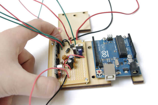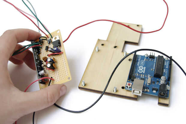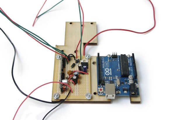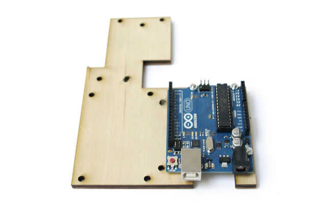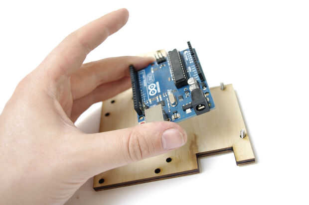 Pegue el Arduino y el circuito al soporte con tornillos y tuercas.