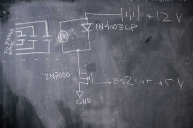 Gancho el circuito del relé hasta el BS2 que tomando un perno alto lanza el relé, y se puede recoger el teléfono con sólo presionar un botón. Ahora estamos listos para marcar.