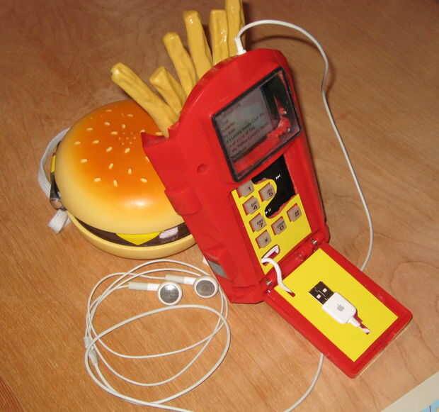 convertí un teléfono de patatas fritas en un estuche para mi ipod video. no tuve razón a la idea que sólo vino a mi cabeza, cuando caminaba sobre mi teléfono hamburguesa ridículamente inconveniente. por qué no llevar una réplica de gran tamaño plástico patatas fritas para que coincida con la hamburguesa de plástico igualmente absurda. la construcción era el mismo que la hamburguesa: el teléfono de la tripa, cortar algunas aberturas, ajuste el gadget y luego atornillarla nuevamente juntos. realmente funciona muy bien (lo protege del sol, tiene su propio cable usb listo para usar), simplemente no cabe en mi bolsillo ya.