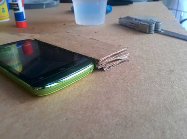 Apilar las piezas de cartón al lado de su teléfono. El objetivo aquí es que el cartón sea más grueso que el teléfono. El cartón le ayudará a crear el asiento para su teléfono en. Iremos añadiendo algunos amortiguador a este asiento, así que asegúrese de que el cartón es más grueso que el teléfono cuando se apilan. La pila de la foto está demasiado cerca el grosor del teléfono. Una pieza más de cartón se debe agregar en esa foto.