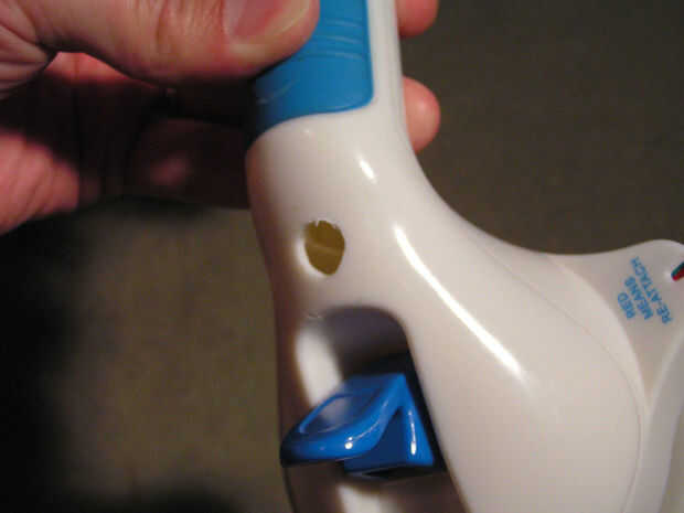 Taladrar un agujero en la parte inferior de la diagonal de la barra de soporte. Asegúrese de no golpear partes vitales. Sacudir los restos de plástico.