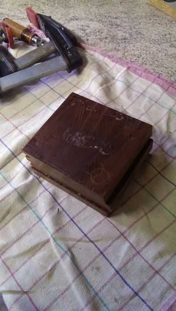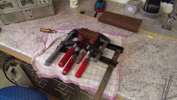 Quería que mina por 4,5 cm de altura, sin embargo mis restos son casi 1,5 cm. de altura, por lo tanto corte tres piezas, que son aproximadamente del tamaño deseado, para encolarlos y alcanzar la altura correcta. Para pegarlos utilicé un pegamento de madera y algunas abrazaderas.