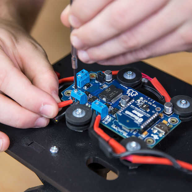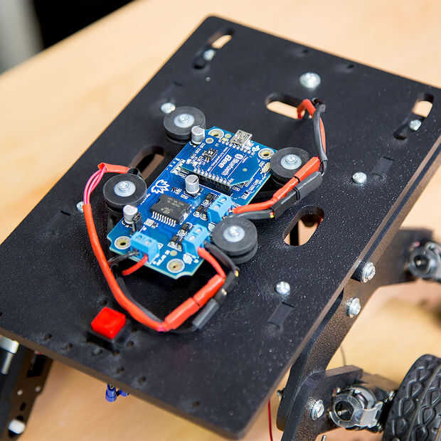 Conecte los cables rojos y negros de un lado del chasis a los terminales del Motor A. Luego conecte los cables rojos y negros del otro lado del chasis a los terminales de tornillo de Motor B.