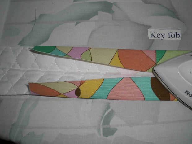 Con parte de la tela hacia arriba, doblar la correa llavero por la mitad y presione, luego despliegue. Con fusible hacia arriba, doblar cada mitad y presionar con hierro.
