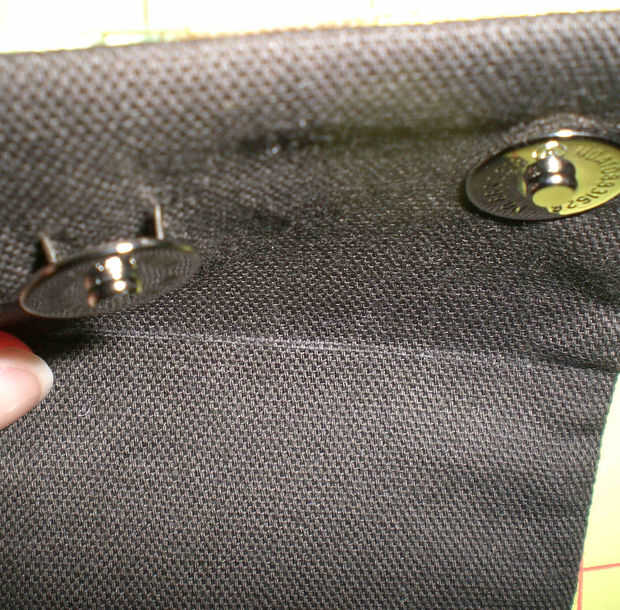 Desde la abertura superior de la correa del bolso/de la correa, instale los extremos hembra de dos 2 cierres magnéticos en la tela principal y el hombre termina de los dos 2 cierres magnéticos en la tela de contraste. Para alinear los cierres, utilice arandelas como plantillas y medir tres cuartos de pulgada (.75 pulg.) desde el borde al centro del círculo en la lavadora. Marcar a la tela con una lápiz/tiza y corte ranuras de tiempo suficiente para cada clavija de cierre. Inserte el cierre en la capa de tela/entretela, añadir la arandela y doble las puntas hacia fuera. Ponga a un lado.