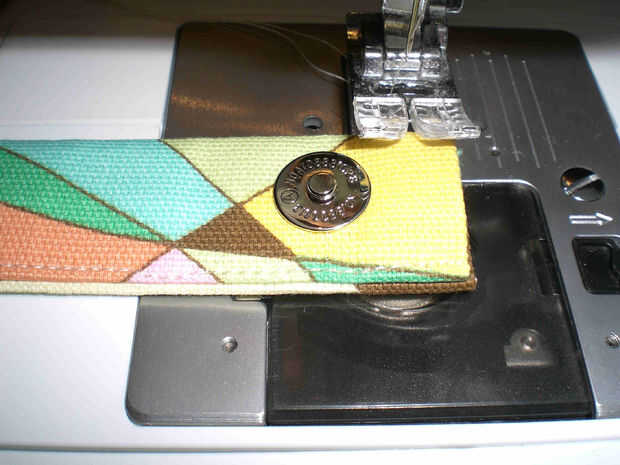 Instale el extremo macho de los cierres magnéticos restantes en el exterior de la correa. El cierre debe ser tres cuartos de pulgada (.75 pulg.) del borde doblado. Marcar a la tela con un lápiz y corte ranuras de tiempo suficiente para cada clavija de cierre.