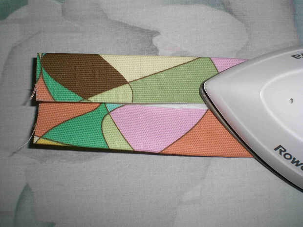 Con parte de la tela hacia arriba, doble la correa de la caja por la mitad y presione, luego despliegue. Con conexión lateral hacia arriba, doblar cada mitad y presione con hierro.