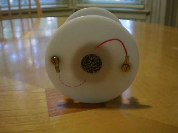 Un pequeño agujero a través del reborde de la bobina cerca de la abertura de la base. Poner unas 3 pulgadas de aislamiento cables de cobre sólido calibre 22 que (llamado cable de conexión, cable del timbre, etc.) a través del agujero que le aburren. Envuelva el carrete con el resto del alambre. Coloque el alambre sobre suavemente, juntas, de un extremo a otro. No superponga las vueltas. Al llegar al final del carrete, invertir la dirección con la bobina. Establecer al menos tres capas de alambre de calibre 22. Al final de la tercera capa, un agujero a través de la brida del carrete y de la alimentación a través de unas 3 pulgadas de alambre. Corte cualquier exceso de alambre. Asegúrese de que el segundo agujero se alinea con la primera, en el extremo opuesto de la bobina. (Estudio de las fotos) Se trata de la bobina primaria de la bobina de inducción de su teléfono. Envolver el alambre con dos capas de cinta aislante, manteniendo todo como suave y cómoda como sea posible.