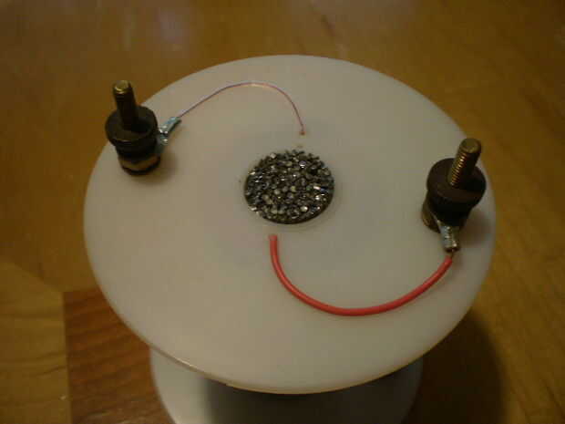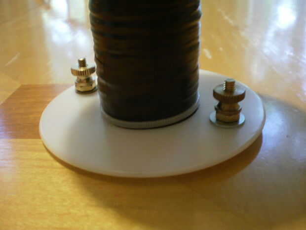 A continuación, perfore un orificio de tamaño de 8-32 en la brida del carrete hacia fuera cerca del borde de 90 grados de los agujeros ya perforados para el secundario y primario conduce. Hacer lo mismo en el punto opuesto 180 grados lejos. Haga agujeros idénticos en la otra pestaña. Elija uno de los extremos de la bobina a ser 'top' y el otro para ser 'inferior'. Inserte un perno de 8-32 hilos de rosca, a través de orificios en la brida superior. Ponga una arandela de latón y una tuerca en cada tornillo y apriete en su lugar. Deslice los conectores de anillo sobre cada tornillo. Añadir una tuerca a cada tornillo y apriete los dedos.