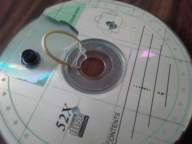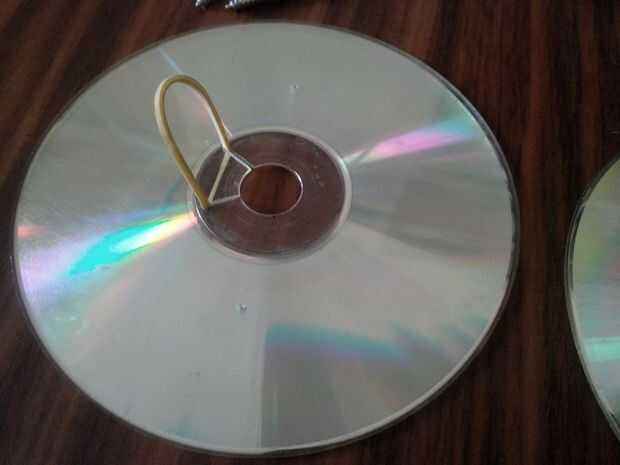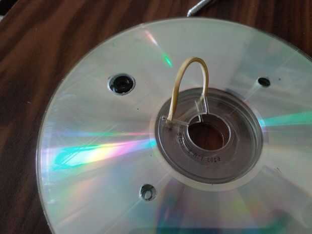 Corte dos ranuras en el interior del eje de todos los tres CDs para sujetar la banda elástica para sostener los tres CD juntos como un sándwich. Iniciar con el CD de la parte inferior, luego el medio y finalmente el CD superior.