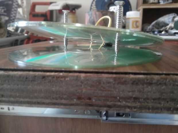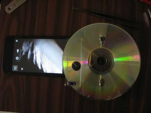 A continuación inserte un lápiz entre la parte superior y mediados CDs para formar el segundo punto de giro. Presionando la parte superior y mediados CDs entre el pulgar y el dedo índice le permitirá ajustar el enfoque muy minuciosamente. Inicialmente planeaba tener otro tornillo para el ajuste de enfoque pero encontró que el flex del CD era suficiente para cambiar el foco de la imagen. El único inconveniente de esto es que pierdes el enfoque si se suelta de los CDs.
