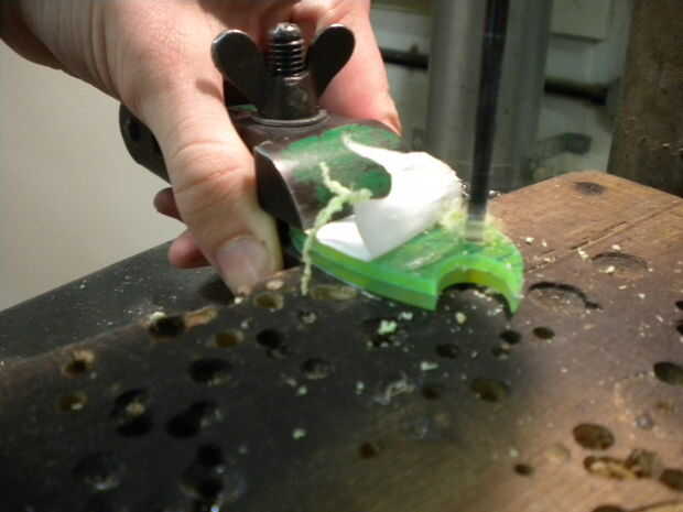 Con dos pedazos de acrílico juntos utilice un tornillo de mano para mantener whist en Ø5mm. Nota el agujero no debe estar demasiado cerca del borde, el agujero se debe perforar lentamente y brocas madera extrañamente parecen ayudar a prevenir roturas.