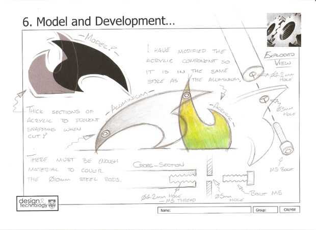 Ahora hacer un modelo de la tarjeta de su idea favorita, los estudiantes pueden mirar evaluar cada otros trabajo en los siguientes criterios; Estabilidad, resistencia, estética, fabricación (capacidad para hacer el diseño). El modelo es desmontado y pegado en la página de modelo y desarrollo anotado con información sobre las discusiones que acaba. El profesor debe esbozar despiece de cómo unirse las barras a los lados.