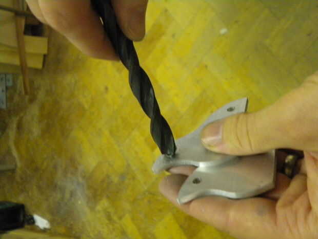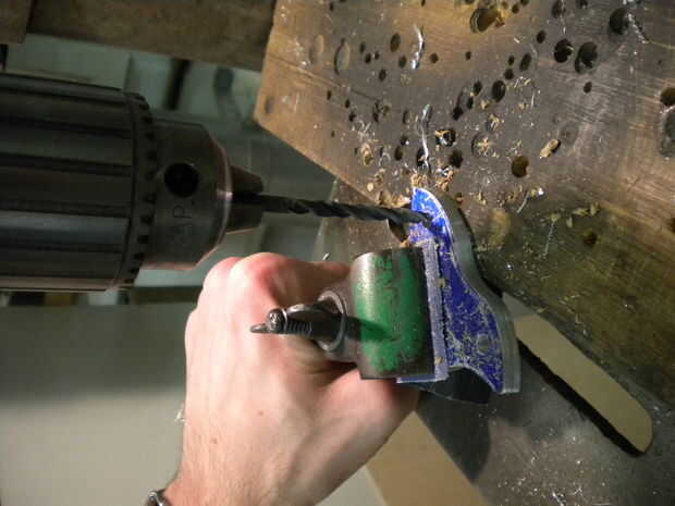 Mantener juntos los dos lados y utilice un tornillo de mano para sujetar con seguridad la pieza de trabajo mientras perforación Ø5mm (Recuerde gafas en, pelo atado, en las mangas). Si hay rebabas en la parte inferior de la pieza de trabajo, utilice una broca Ø10mm para eliminarlos a mano.