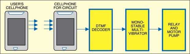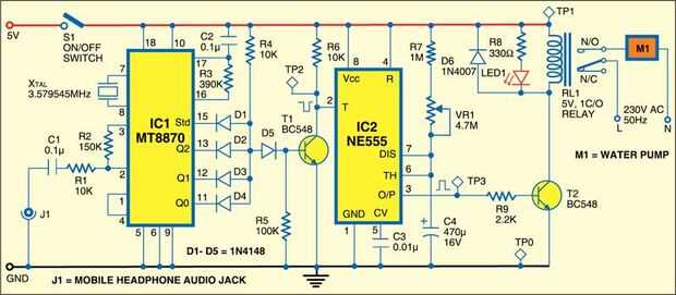 La figura 1 muestra el diagrama de bloques de control remoto basados en teléfono móvil para bomba de agua. Figura 2 muestra el circuito. El circuito está construido alrededor de decodificador DTMF MT8870 IC (IC1), temporizador NE555 (IC2) conectado como multivibrador monoestable y unos pocos componentes discretos. El componente principal del circuito es IC MT8870. Este decodificador DTMF tiene filtro de banda dividida y decodificador digital funciones. Ofrece las ventajas de tamaño pequeño, bajo consumo y alto rendimiento.