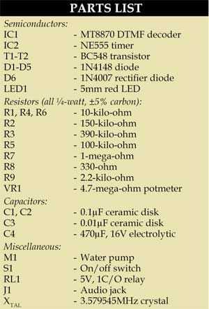 El controlador de bomba de agua está conectado a un teléfono celular dedicado a través del conector J1 con modo contestador automático está activado. La señal DTMF enviados desde el usuario final es decodificado por el decodificador DTMF y el correspondiente valor de decimales codificados en binario (BCD) aparece en las salidas Q0 a Q3. En este circuito se utilizan sólo tres de ellos.