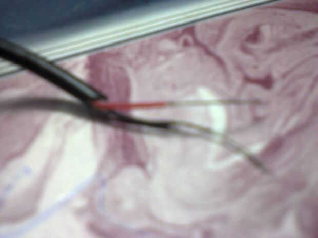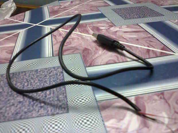 Paso 3) ahora toma el cable USB y corta hasta la longitud apropiada y retire el recubrimiento plástico de los cables para conectar a la clavija del cargador. (Aquí he cortado el extra dos de alambre en el cable USB < verde y blanco > porque solo falta el negro y los rojos, que son polaridades y (-) los otros dos que tengo strippen apagado son los datos (+) y datos (-), no necesita los.)