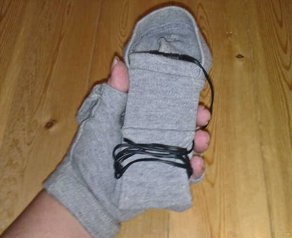 El móvil de phone/MP3 jugador con capucha tiene una bolsa frontal (como en muchas sudaderas) y puede utilizar éste para envolver tus audífonos cuando no están en uso por lo que permanecen fuera del camino. La bolsa permanece cerrada con una tira de velcro.