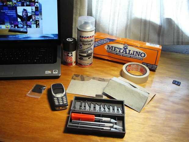 - Teléfono móvil - Pintura de aerosol con un bonito color - Primer plástico - Hoja o 2 de papel de lija, por lo menos 1 hoja tiene que ser de grano 400 o más - Rollo de cinta - Cuchillo de corte de precisión