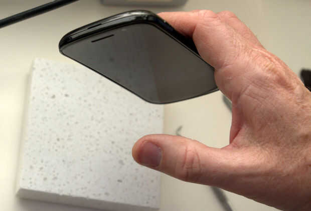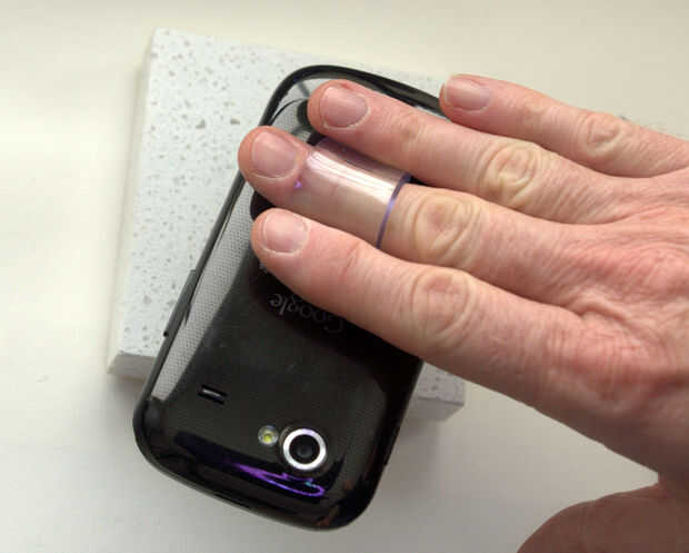 El hack es bastante fácil. Coloque una pequeña tira de vinilo grueso a la parte posterior de una tapa de teléfono celular. Puede haber varias formas de hacer esto, pero aquí es mi enfoque.