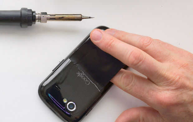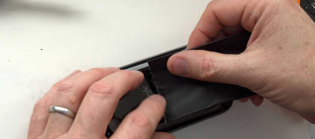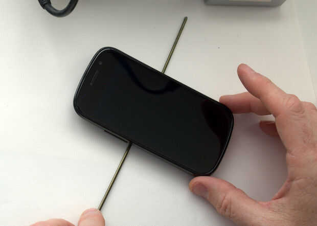 La posición de la prueba utilizando alguna cinta adhesiva o cinta adhesiva. Esto no es difícil de averiguar. Doble la cinta por lo que no es pegajoso en todas partes excepto donde se conecta al teléfono. Corte por lo que es una derecho razonable de ancho/altura. Fije a la parte posterior del teléfono.