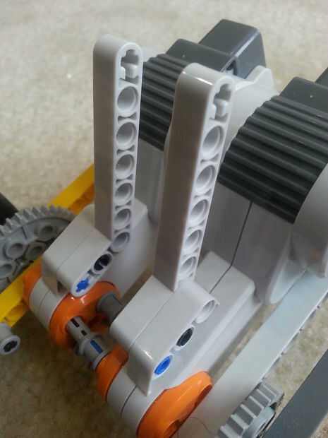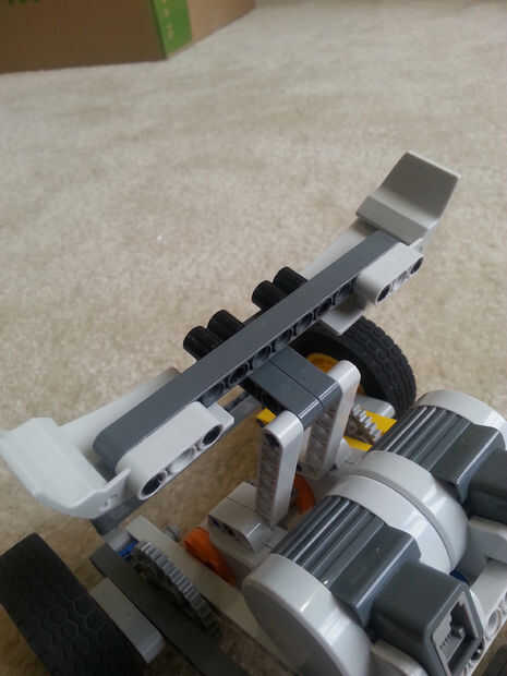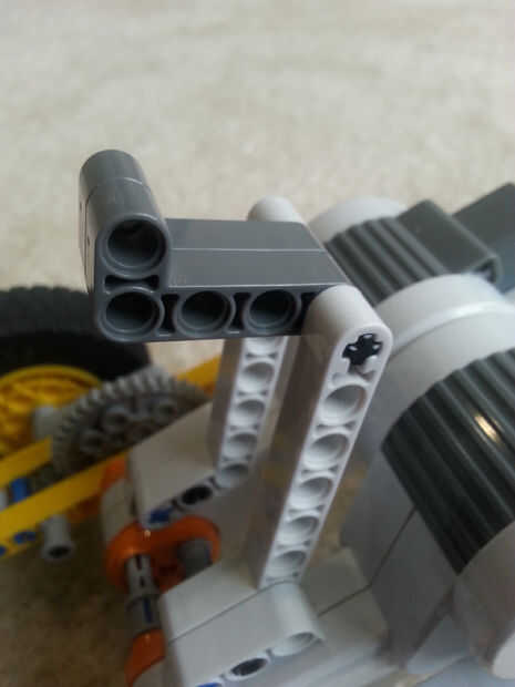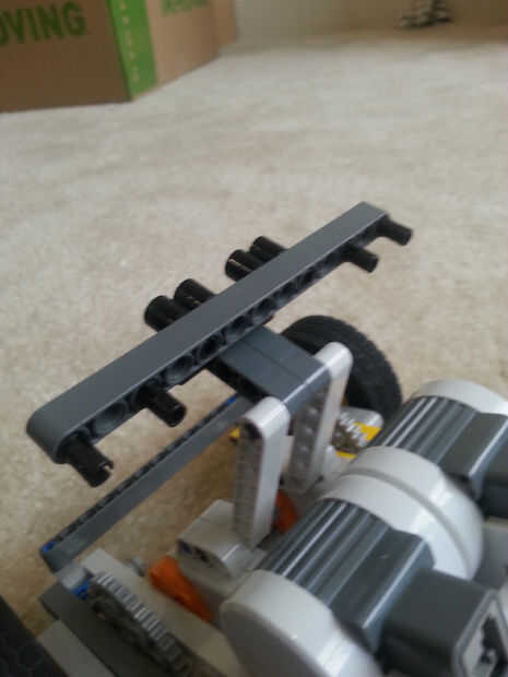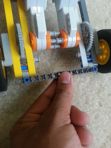 A continuación, colocar una viga de 13 montantes a los dos pines azul en la parte posterior de los ensamblajes de rueda. Un montante que jut hacia fuera, no importa que camino. (Imagen 4)