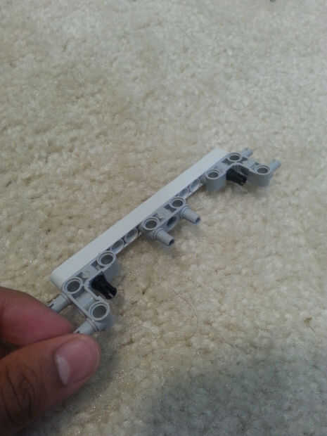 Comenzar colocando el conector H al centro de la viga de 13 postes. Instale conectores de dos L en el mismo lado pero en cada extremo. A continuación, agregue en negro uno de los pines de ambos conectores L. (Foto 2)