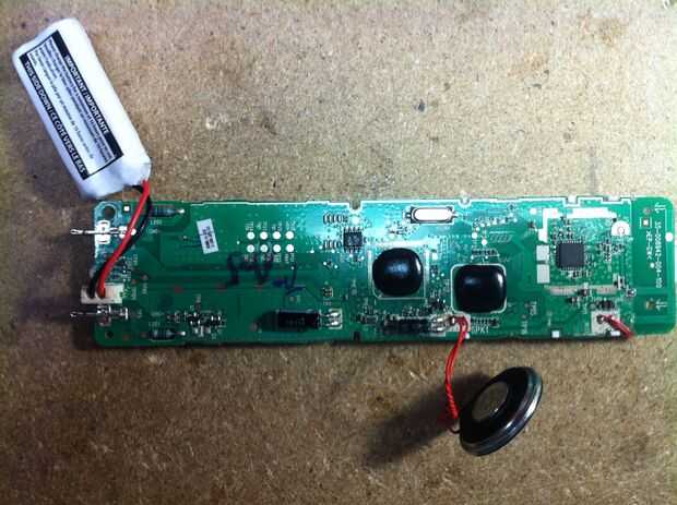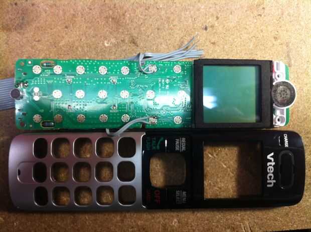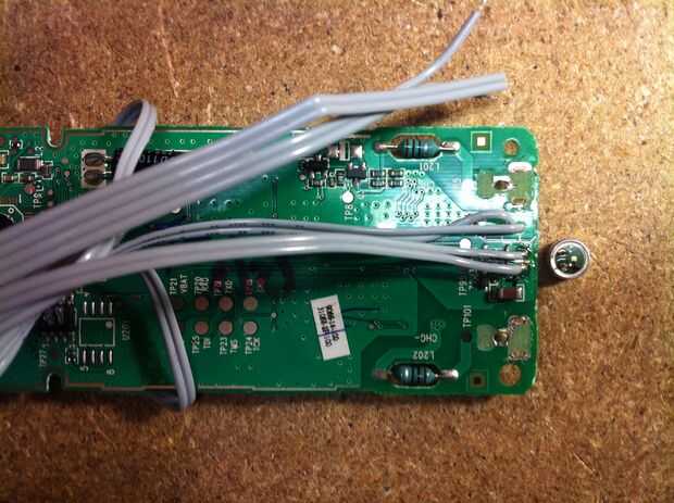 -Recogida en el auricular inalámbrico. Con un voltímetro de DC, Compruebe la polaridad de la mic (electret). Tensión debe ser 1 a 2V. Tenga en cuenta el lado positivo en el PCB y en el mic.