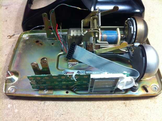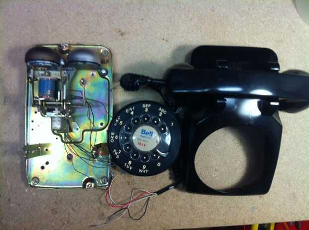 -Desmontar el teléfono rotatorio y retire la pieza interna entera dentro, excepto el timbre electromecánico, el interruptor de la pick-up y el dial.