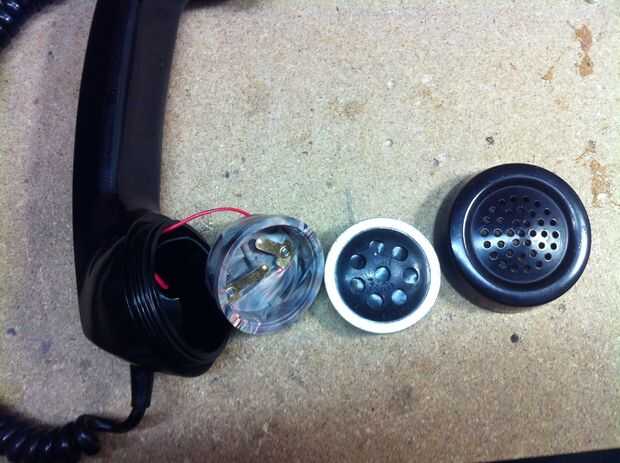-Desenroscar el teléfono para tener acceso al micrófono de carbón. Quitar el micrófono y su apoyo.