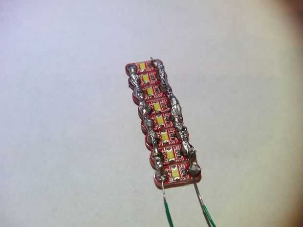 Necesita soldar todo el led de juntos (+ a + y - a-) utilicé 8 40mAh 5 voltios llevadas de pero puede como muchos led de como quieras (sugiero no más de 2 watt de LEDs)