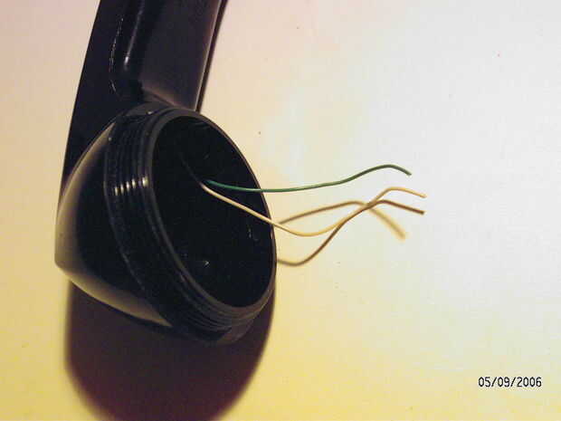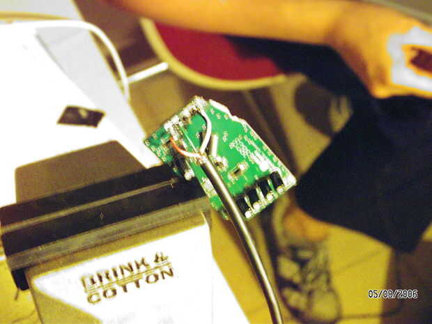 Ahora, tome el extremo cortado de la Junta de logitech y el cable usb. Ahora comenzarás a la soldadura de los alambres en el extremo de la usb. Si te fijas bien, verás que la Junta realmente te dice donde poner cada cable. Va de izquierda a derecha, rojo, verde, negro, blanco. Pase el cable por el agujero y la soldadura en la placa.