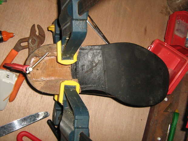 Asegúrese de que el teléfono se ajusta en el agujero. Ahora puede pegar o clavar el tacón de madera en el zapato.