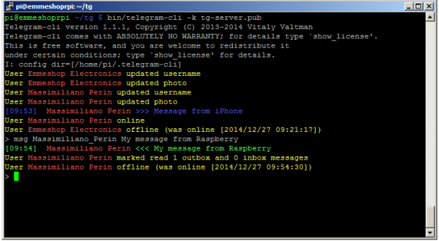 Ahora estamos listos para utilizar el telegrama, si usted envía un mensaje desde tu smartphone puedes verlo en la terminal.