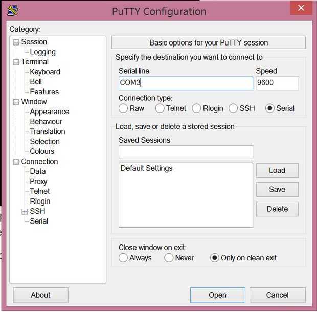 Ahora abra la masilla. Seleccione el botón "Serial" y modificar al puerto correcto. Usar una velocidad en baudios de 9600, así. Esto es específico para el código para el microcontrolador para no cambie. Una vez abierto, escriba lo siguiente: