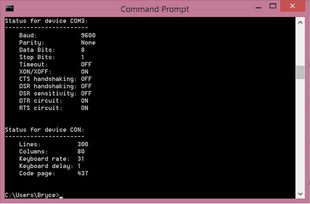 Hay recursos maravillosos en la comprensión de puertos serie. Aquí está la descripción básica. Un puerto serie es una forma sencilla para hablar con un microcontrolador con un ordenador. Usamos esto para contar los servos lo deben hacer. Para probar el puerto serie y nuestros servos utilizo masilla. Normalmente se utiliza para comunicaciones de red, pero desde windows habían quitado hyperterminal he vuelto a masilla. Si usas linux, me gusta gtkterm, se siente mucho como masilla. Desde este punto utilizo masilla. Antes de abrir la masilla deberás figura hacia fuera qué puerto está enchufado su VSP. Simplemente abra un símbolo del sistema escribiendo "cmd" en cualquiera de windows muchas opciones de búsqueda. En la ventana de comandos escriba "modo". Debe mostrar algo que parece la ventana de terminal se muestra. Note que este informa "COM3" pero ustedes pueden mostrar muchos. Yo simplemente desenchúfela y ver que uno desaparece y luego reaparece cuando la conecto en.
