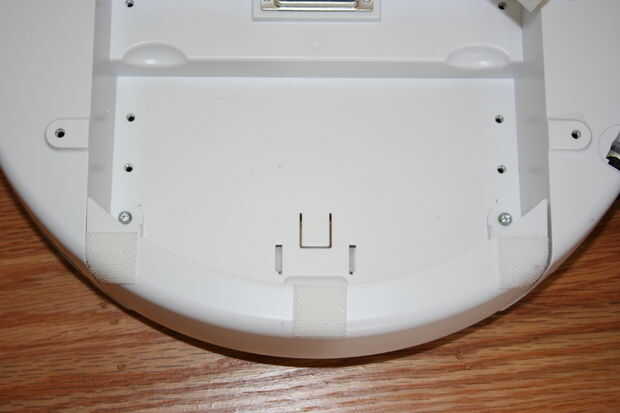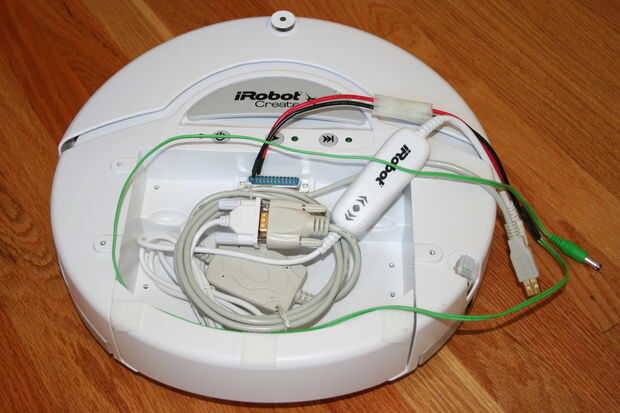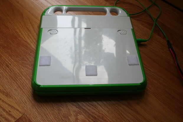 Conecte todos los cables a la crear y envolver cuidadosamente para arriba en la bahía de carga. Dejar una pequeña holgura en los extremos de la serie, el poder y cables USB para alimentar a través del mango de la OLPC. Luego pegar la OLPC en la cima de la creación.