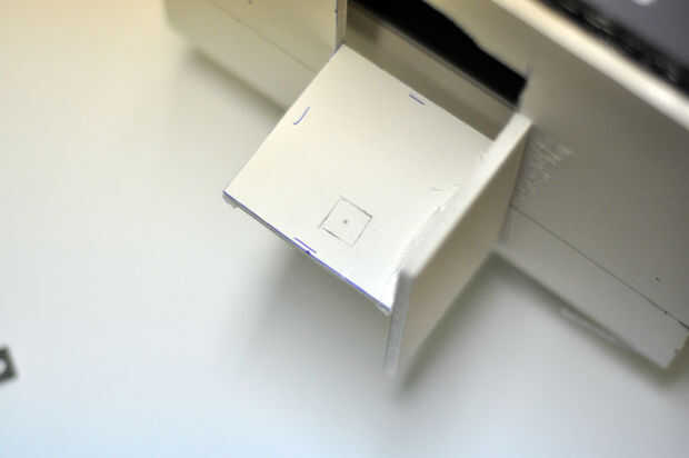 Hacer una cubierta para la parte trasera de cartón pluma y caliente pegamento en su lugar. Luego corte un agujero para la cámara, asegurándose de que el centro de la lente está en el centro del área visible al mirar la cabeza del apuntador en.