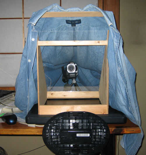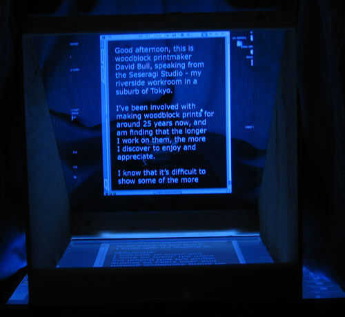 La segunda foto - con mi flash apagado - nos deja ver el teleprompter en acción... Clara y fácil de leer. Cuando estoy listo para iniciar la grabación, usaré remoto de la cámara para iniciar la grabación, a continuación, seleccione el comando 'Automáticamente el Scroll' del menú 'Ver' Adobe Reader (o en realidad, sólo tiene que utilizar el comando de teclado).