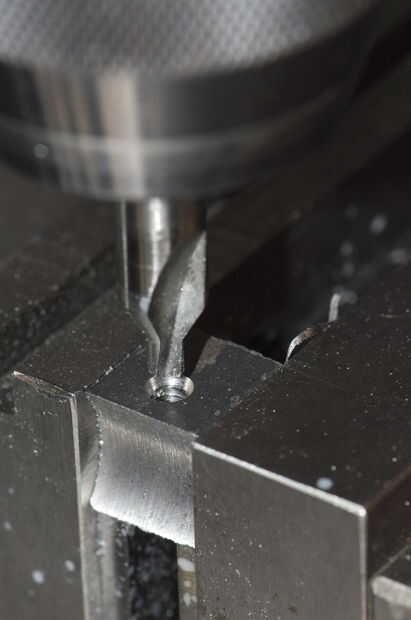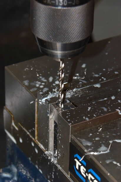 Se enroscará solo la mitad del agujero, así que no tengas miedo a la penetración que centro-taladro hasta el hombro, un poco más de 0,25"(la mitad de la anchura de pestaña de 0.5"). Esta mitad de la longitud del agujero, que no se enroscará, se perforarán más grande más adelante, para hacer espacio para el tornillo de paso.