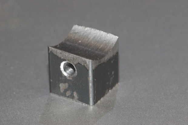 Decidir qué tamaño de tornillo que vas a utilizar para tensar el tubo y perfore agujeros en las lengüetas, perpendiculares al eje de la cara de la ficha curva. Para los tornillos #8-32 que utilizo, perfore un agujero de 0,140". Taladre el agujero como cerca de la cara curva de la pestaña como sea posible, para que la tensión del tornillo no actúa en gran parte de un brazo de palanca: no queremos doblar la pestaña, pero usarlo para aplicar tensión a la pared del tubo.