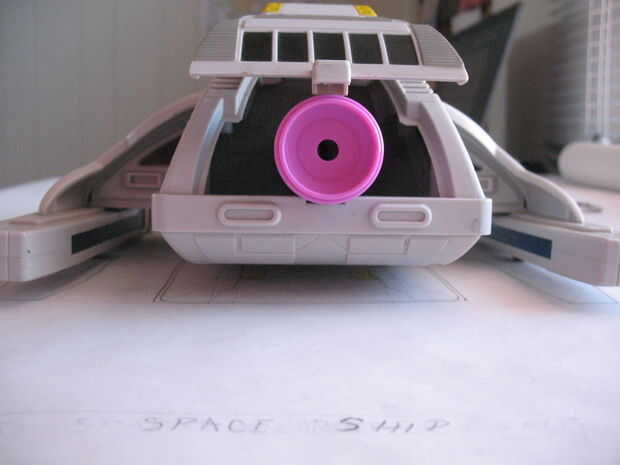 Asegure la parte posterior del telescopio con el cable por un extremo pegado a la parte inferior de la nave, estire el cable sobre el telescopio y pegar el otro extremo de la cuerda a la parte inferior de la nave en el lado opuesto. Repita este paso en la parte frontal del telescopio.